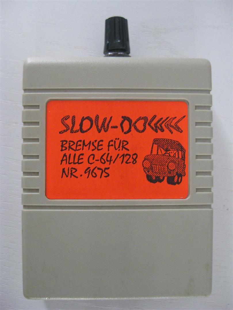 Das Slow Down Modul 9675 ist eine Bremse für den C64/C128. Die Prozessorgeschwindigkeit kann bis zum Stillstand runtergedreht werden. Dieses Modul wurde mit einem anderen Label auch von Rex Datentechnik vertrieben.