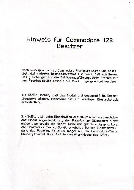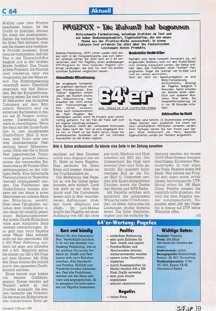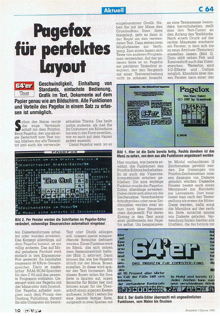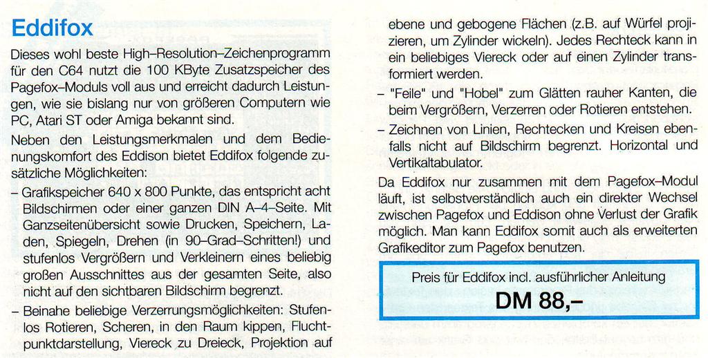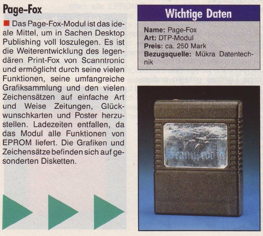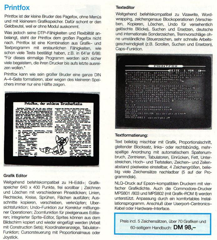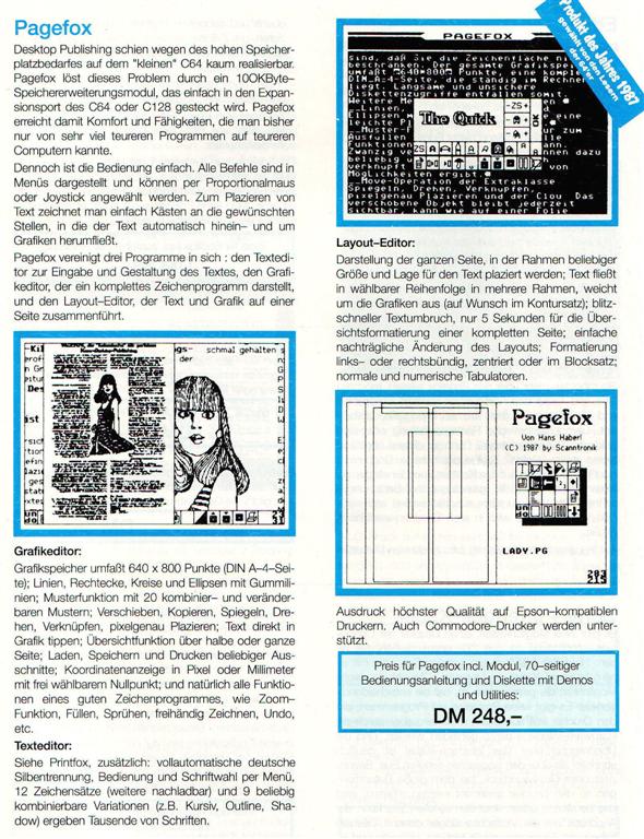 Desktop Publishing schien wegen des hohen Speicherbedarfs auf dem C64 kaum realisierbar. Pagefox löst das Problem durch ein 100Kbyte Speichererweiterungsmodul, das einfach in den Expansionsport des C64 oder C128 gesteckt wird. Pagefox vereint drei Programme in sich : Einen Texteditor, einen Grafikeditor und den Layout-Editor. Ausdruck höchster Qualität auf Epson-kompatiblen Druckern. Auch Commodore Drucker werden unterstützt. VK-Preis : 248,- DM