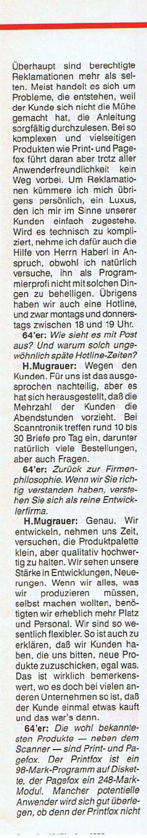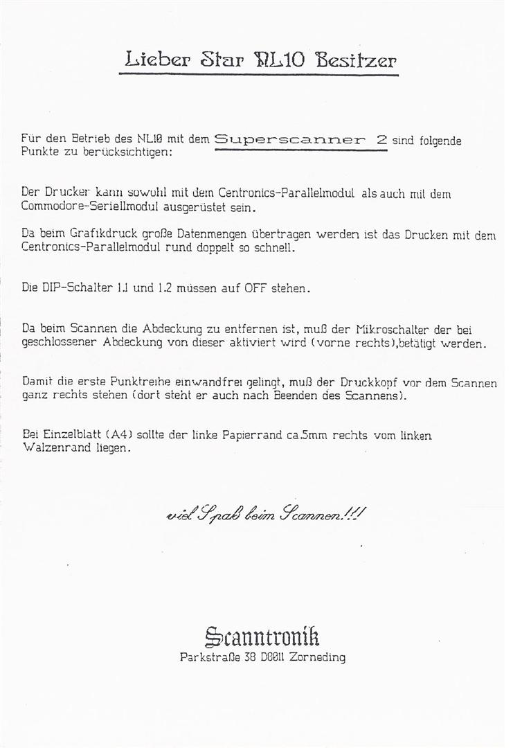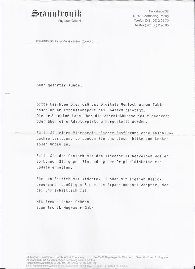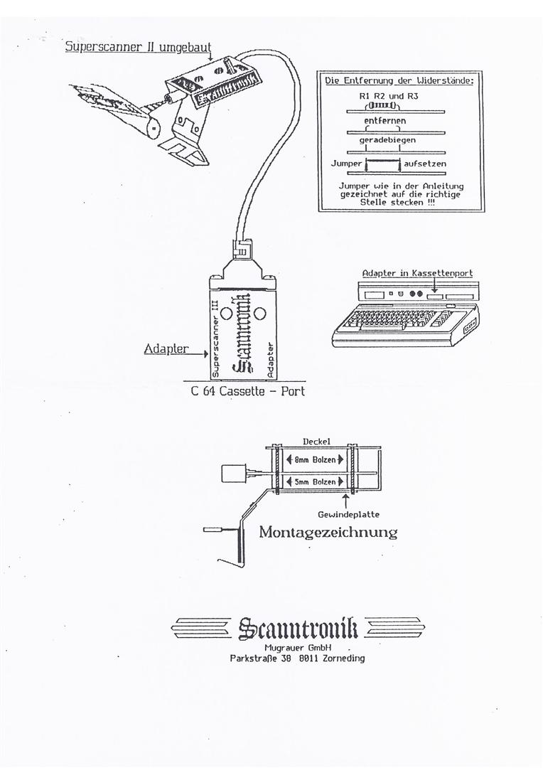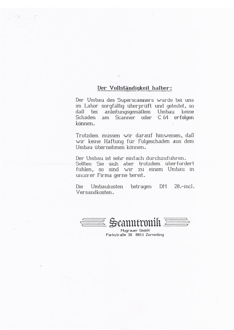 „Hallo Jürgen, einer Veröffentlichung, mit nicht kommerziellem Zweck, unserer C64 Produkte stimmt Scanntronik GmbH bis auf Widerruf zu. Wir machen darauf Aufmerksam, dass wir aber keinerlei weitere Unterstützung leisten können. Aus der C64-Scanntronik ist eine Firma entstanden die sich heute mit der Entwicklung von elektronischen Aufzeichnungsgeräten (Datenloggern) beschäftigt. http://www.Scanntronik.de über einen Link auf Deiner Homepage würden wir uns freuen. Weiterhin viel Spaß und Erfolg mit Deiner Homepage. Eine gute Idee ! Mit freundlichen Grüßen Scanntronik Mugrauer GmbH Hubert Mugrauer“ 20.05.2009