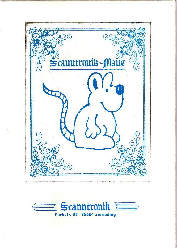 Die Scanntronik-Maus ist eine echte Proportional-Maus. Bei dieser Version läßt sich auf der Unterseite zwischen den Betriebsarten Joystick oder 1351-Maus wechseln. Zusammen mit der Maus erhalten Sie ein umfangreiches Software-Paket : Cheese, Cheeseprinter und Loader. Außerdem Maustreiber für Hi-Eddi+ und GEOS. VK-Preis : 109,- DM