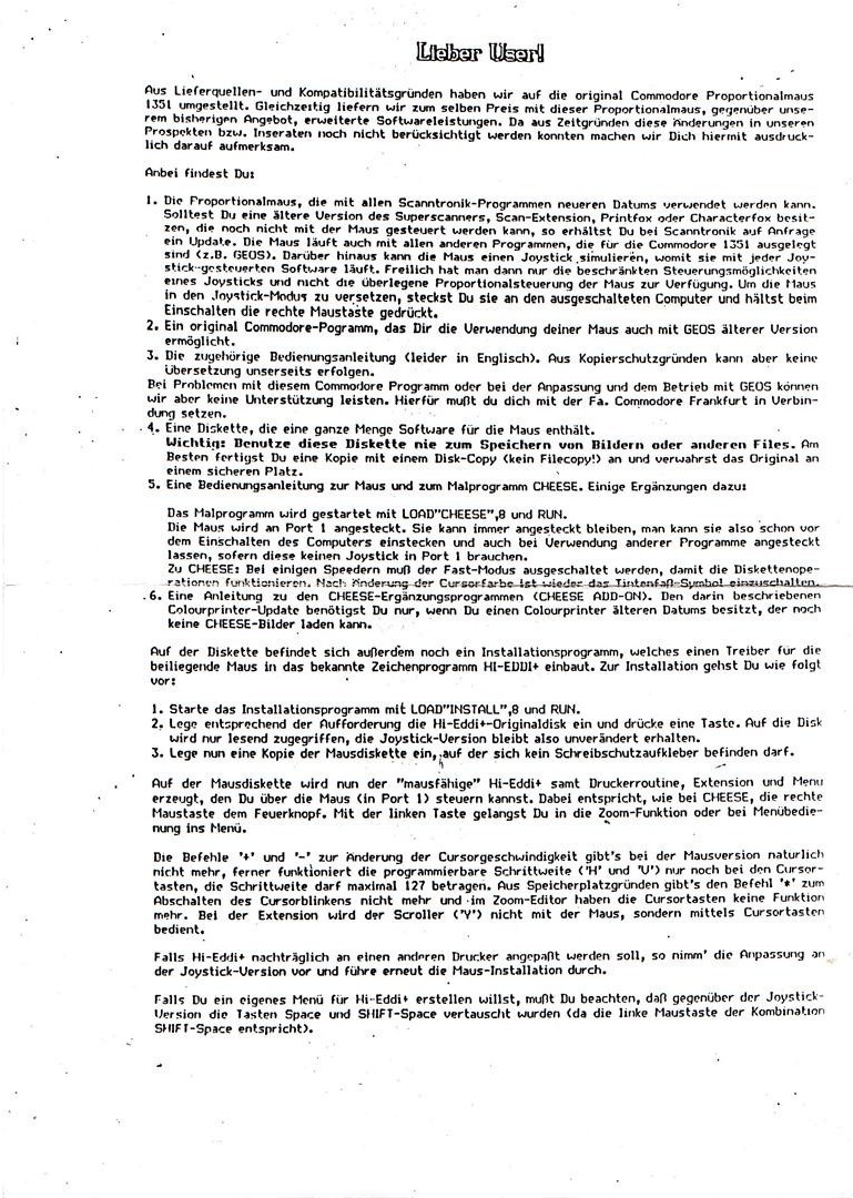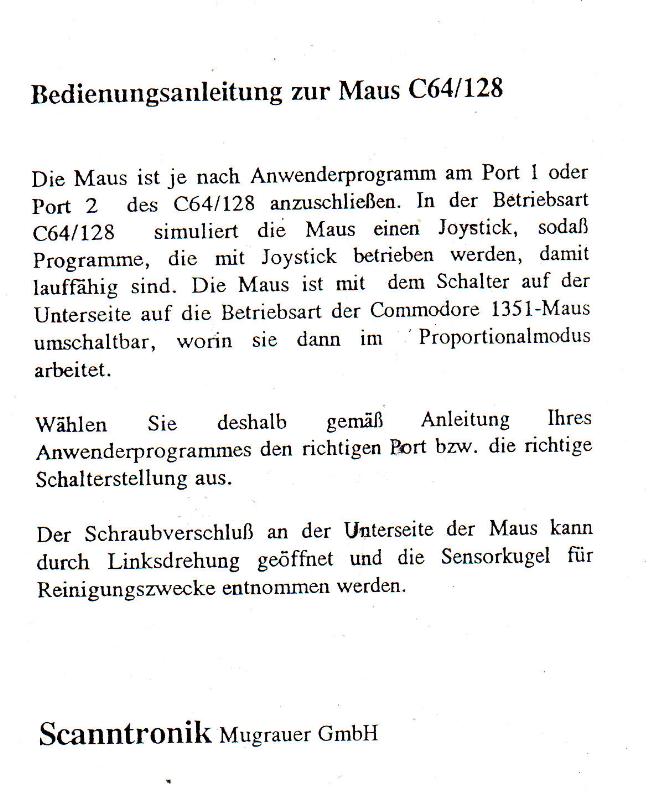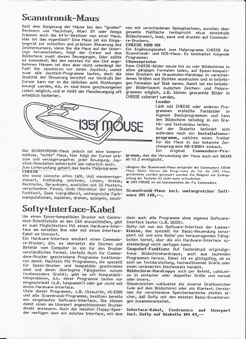 Die Scanntronik-Maus ist eine echte Proportional-Maus, sie entspricht der Commodore 1531. Zusammen mit der Maus erhalten Sie ein umfangreiches Software-Paket : Cheese, Cheeseprinter und Loader. Außerdem Maustreiber für Hi-Eddi+ und GEOS. VK-Preis : 148,- DM