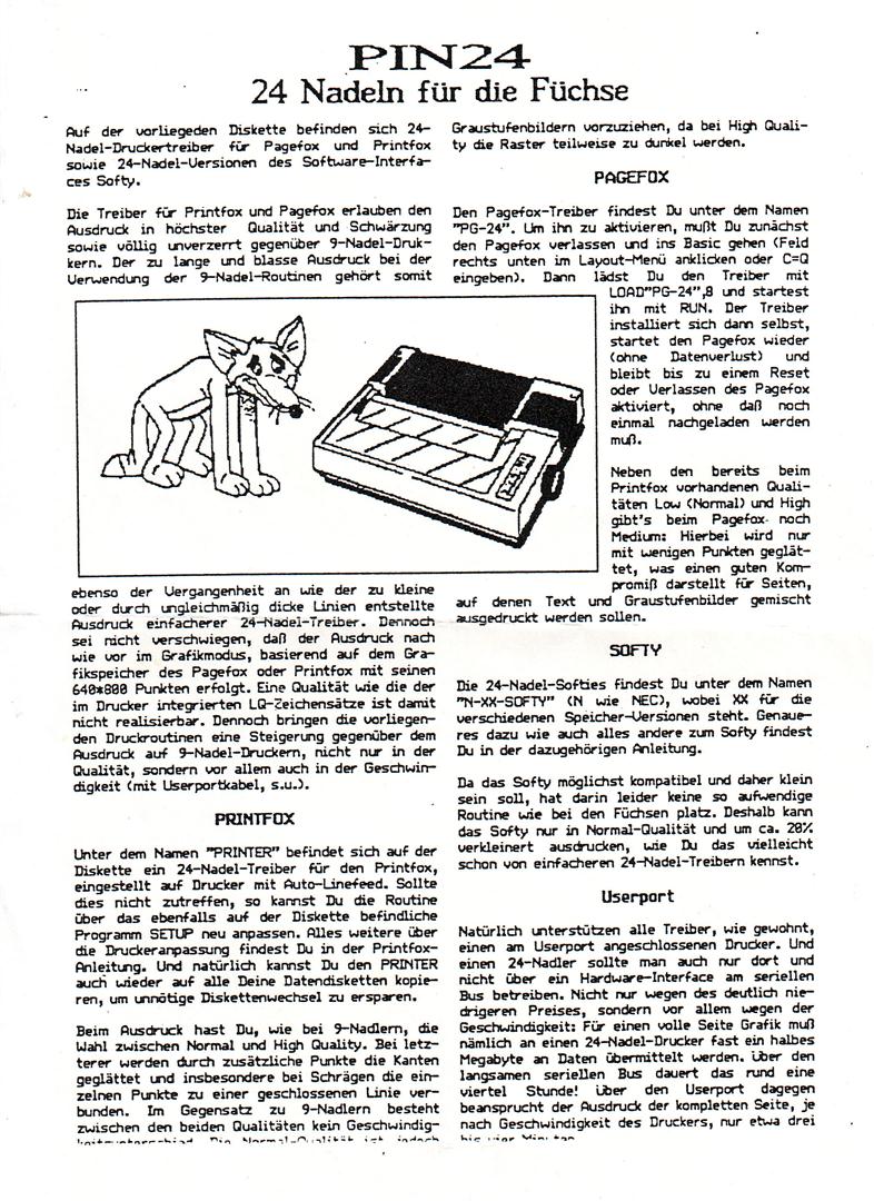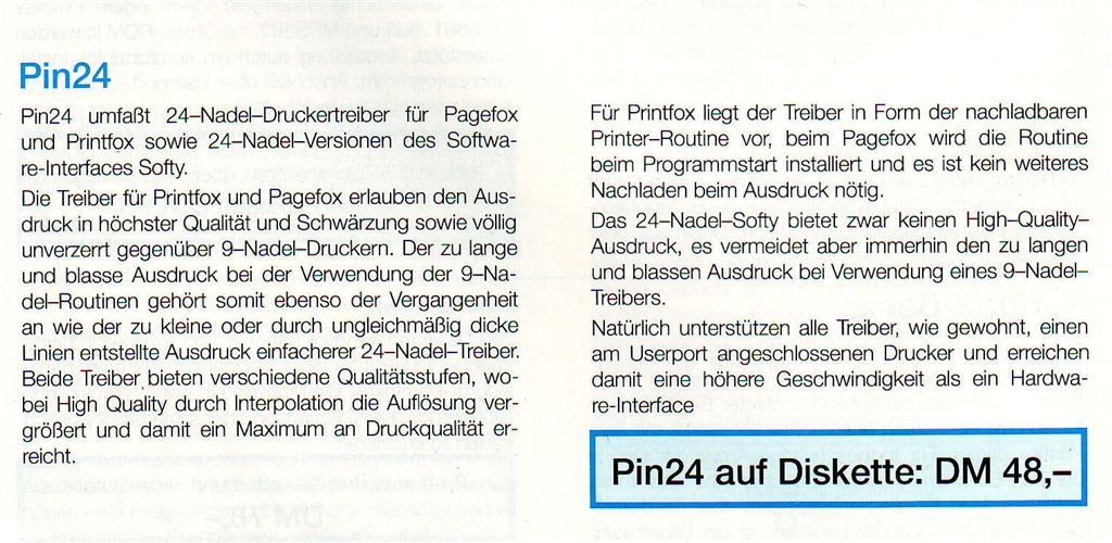 Pin 24 umfaßt 24-Nadel-Druckertreiber für Pagefox und Printfox sowie die 24-Nadel-Version des Software-Interfaces Softy. VK-Preis: 48,- DM
