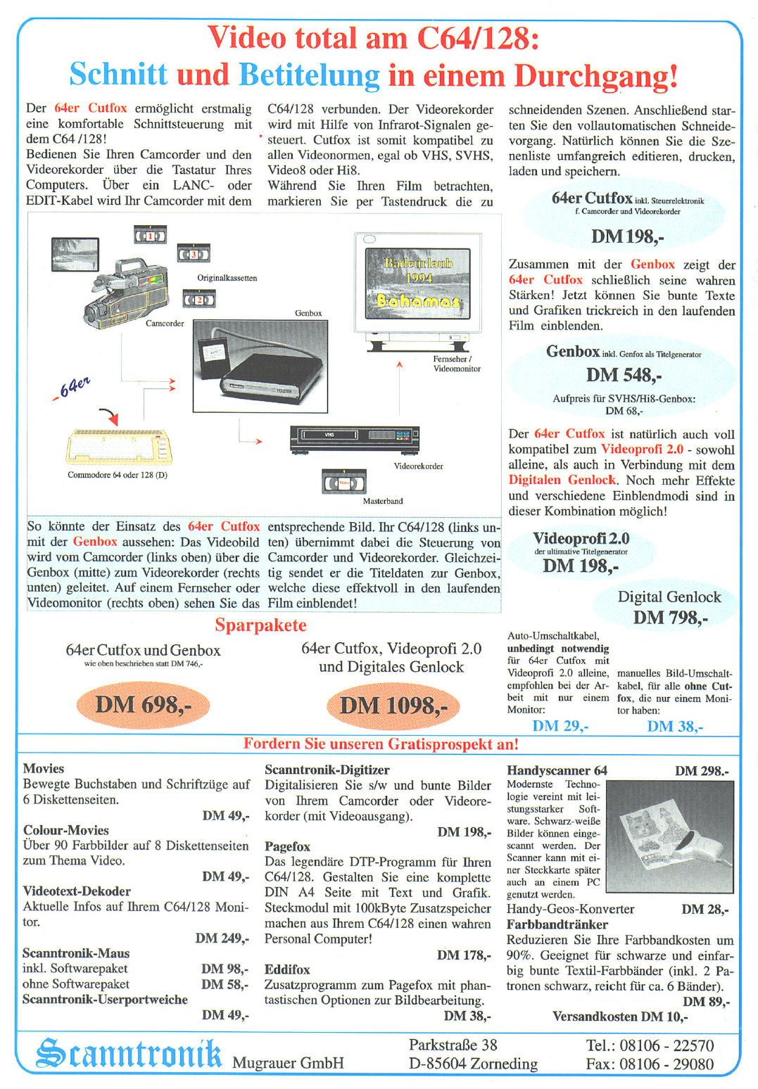 Mit der Genbox stehen Ihnen in einem Gerät zugleich ein Genlock und ein Titelgenerator (Genfox) zur Verfügung. Das Genlock übernimmt dabei das korrekte Mischen Ihres C64-Signals mit dem Videobild, während der Genfox die zahlreichen Effekte, wie zum Beispiel Laufschrift oder Untertitel, ermöglicht. VK-Preis: 498,- DM