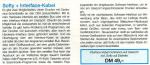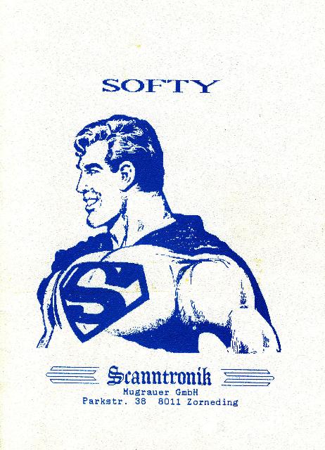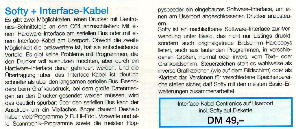 Softy ist ein nachladbares Software-Interface zur Verwendung unter Basic, das nicht nur Listings sondern auch originalgetreue Bildschirm Hardcopys druckt. Das Interface Kabel wird mit dem Userport verbunden. Die Datenübertragung ist wesentlich schneller als mit einem Hardware-Interface. VK-Preis 49,- DM