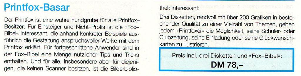 Drei Disketten mit über 200 Grafiken in bestechender Qualität zu einer Vielzahl von Themen, geben jedem Printfox Besitzer die Möglichkeit, seine Schüler- oder Clubzeitung, seine Einladungen oder seine Glückwunschkarten zu illustrieren. VK-Preis : 78,- DM