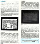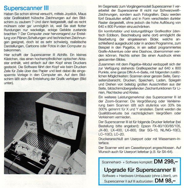 Ein kleines Kästchen, das einen hochempfindlichen optischen Abtaster enthält, wird einfach auf den Druckkopf gesteckt. Die Software fährt wie beim Drucken Zeile für Zeile über das Papier und liest die eingespannte Vorlage in den Computer ein. Im Gegensatz zu seinem Vorgänger verarbeitet der Superscanner III auch Fotografien. Dazu werden fünf Graustufen erfaßt und in Form verschieden dunkler Raster dargestellt, ohne jedoch die hohe Auflösung von 640×800 Punkten einzuschränken. VK-Preis : 298,- DM