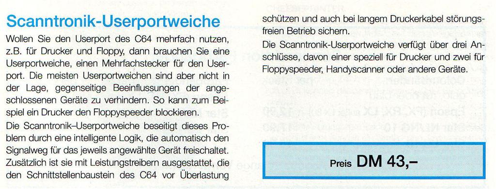 Die intelligente Logik schaltet automatisch den Signalweg für das jeweils angewählte Gerät frei. Zusätzlich ist sie mit Leistungstreibern ausgestattet, die den Schnittstellenbaustein des C64 vor Überlastung schützen und auch bei langem Druckerkabel störungsfreien Betrieb sichern. Die Userportweiche verfügt über drei Anschlüsse, davon einer speziell für Drucker und zwei für Floppyspeeder, Handyscanner oder andere Geräte. VK-Preis : 43,- DM