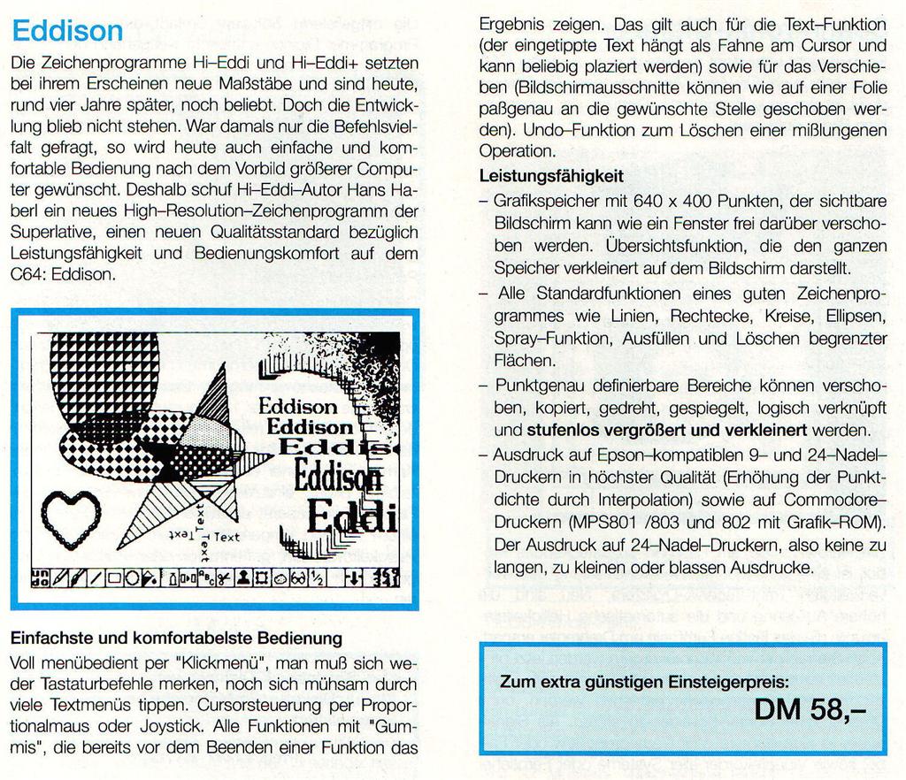 Eddison vereint alle Standartfunktionen eines guten Zeichenprogramms wie Linien, Rechtecke, Kreise, Ellipsen, Spay-Funktionen, Ausfüllen und Löschen begrenzter Flächen. Eddison bietet einen Grafikspeicher von 640×400 Punkten. VK-Preis : 58,- DM