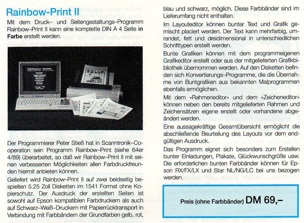 Mit dem Druck- und Seitengestaltungsprogramm kann eine komplette DIN A4 Seite in Farbe dargestellt werden. Das Programm eignet sich besonders zum Erstellen von Einladungen, Plakaten, Glückwunschgrüßen u.s.w. VK-Preis : 69,- DM