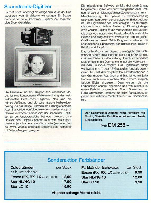 Die Hardware, ein am Userport anzusteckendes Modul, ist eine konsequente Weiterentwicklung des weitverbreiteten Print-Technik-Digitizers. Neu sind die höheren Auflösungen und die automatische Helligkeitsregelung. Auch Standbilder von Videorekordern werden jetzt problemlos verarbeitet. Als Signalquelle ist jede Kamera oder Camcorder (s/w oder farbe) sowie Videorekorder aller Systeme oder Fernseher mit Video-Ausgang geeignet. VK-Preis : 258,- DM