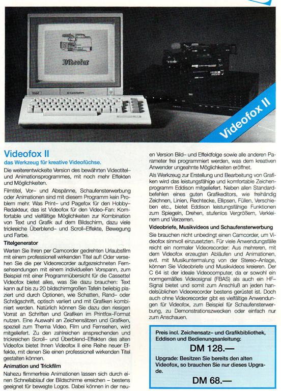 Weiterentwicklung des Videofox. Filmtitel, Vor- und Abspänne, Schaufensterwerbung, Animationen oder kleine Trickfilme sind mit diesem Programm kein Problem mehr. Vielfältige Möglichkeiten zur Kombination von Text und Grafik auf dem Bildschirm, dazu viele trickreiche Überblend- und Scrolleffekte, Bewegung und Farbe. Der Videofox II besitzt einen leistungsstarken Titelgenerator. Text kann auf bis zu 20 bildschirmgroßen Tafeln beliebig plaziert und durch Optionen, wie Schatten, Rand- oder Schrägschrift, optisch variiert und mit Grafiken kombiniert werden. VK-Preis : 128,- DM