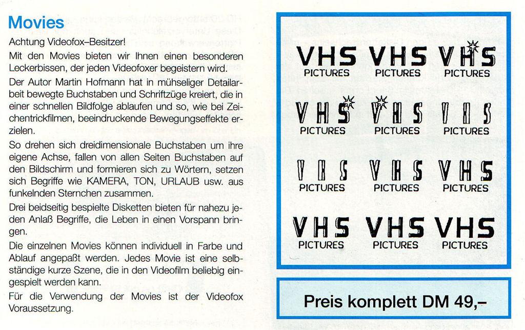 Eine Kollektion von Farbbildern und Vorspännen für den Videofox II. Bewegte Buchstaben und Schriftzüge die in einer schnellern Bewegung ablaufen und so wie bei Zeichentrickfilmen, beeindruckende Bewegungseffekte erziehlen. So drehen sich z.B. dreidimensionale Buchstaben um ihre eigene Achse, fallen von allen Seiten Buchstaben auf den Bildschirm und formatieren sich zu Wörtern wie Kamera, Ton, Urlaub aus funkelnden Sternchen zusammen. VK-Preis : 49,- DM