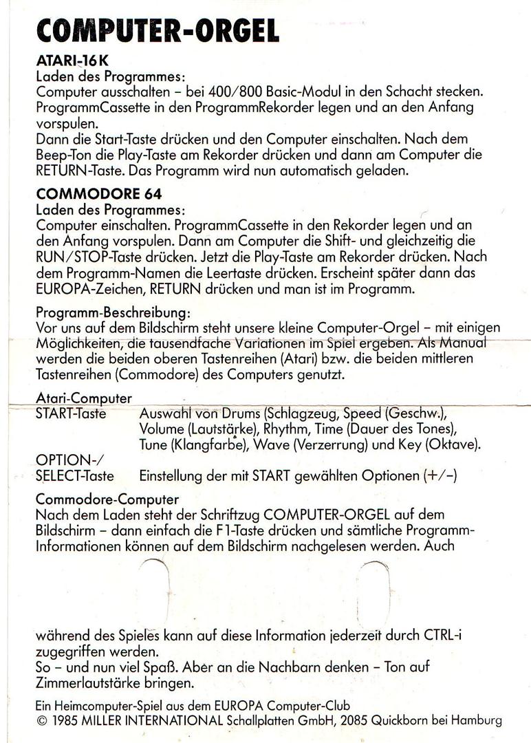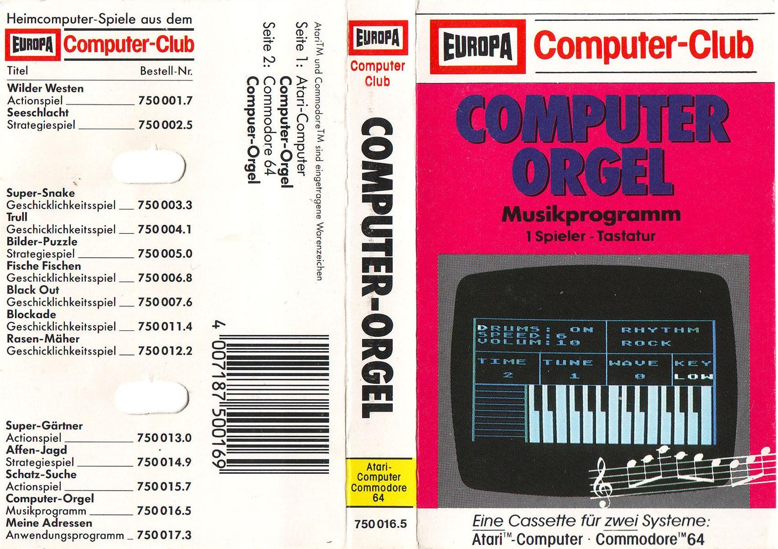 Das Musikprogramm Computer Orgel kam 1985 von der durch Hörspiele bekannten Firma Europa auf den Markt. Das Copyright liegt bei der Miller International Schallplatten GmbH. Auf der Kassette ist sowohl das Programm für den Commodore 64 als auch eine Version für Atari Computer. So konnte man zwei Käuferschichten gleichzeitig bedienen.
