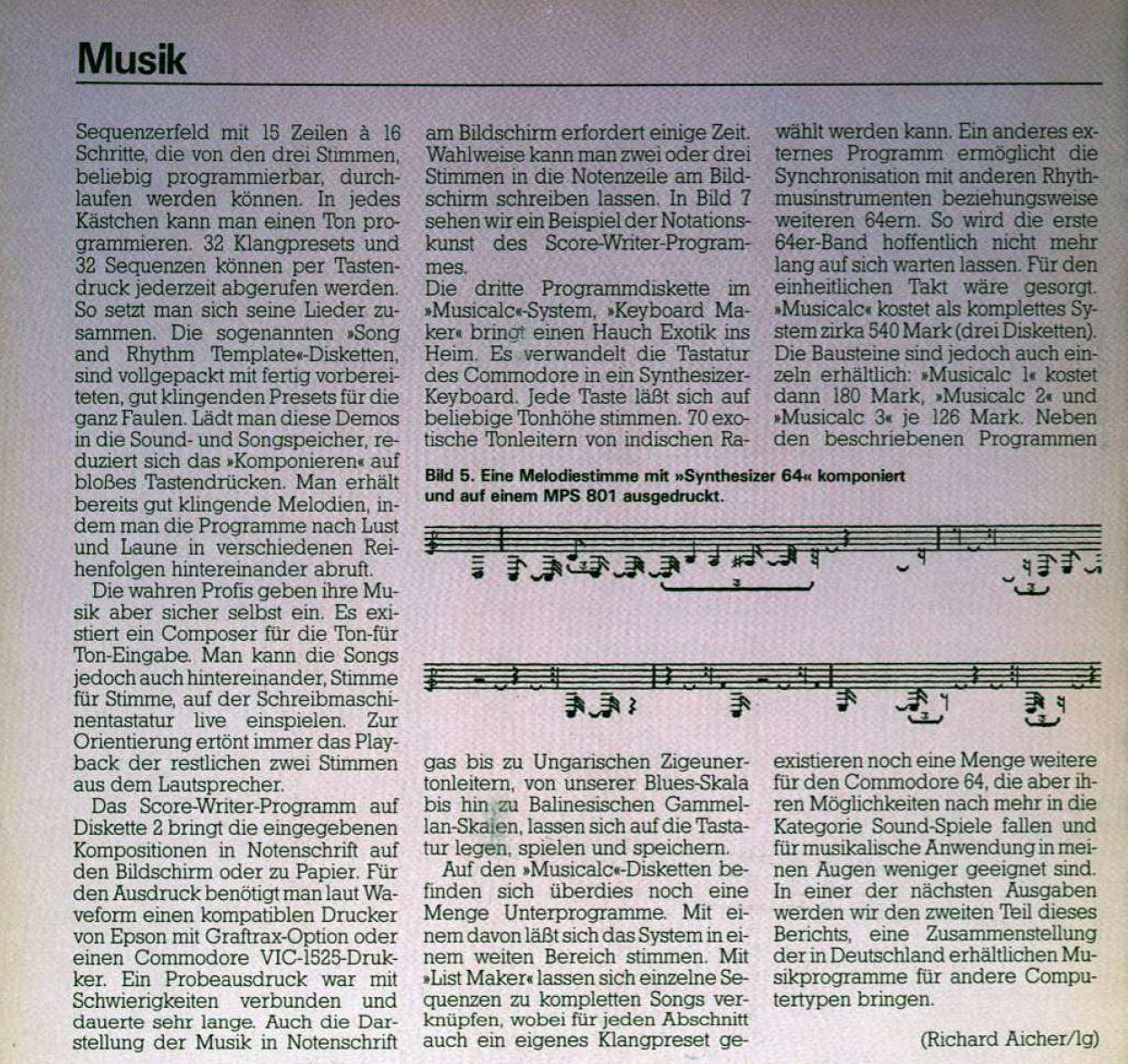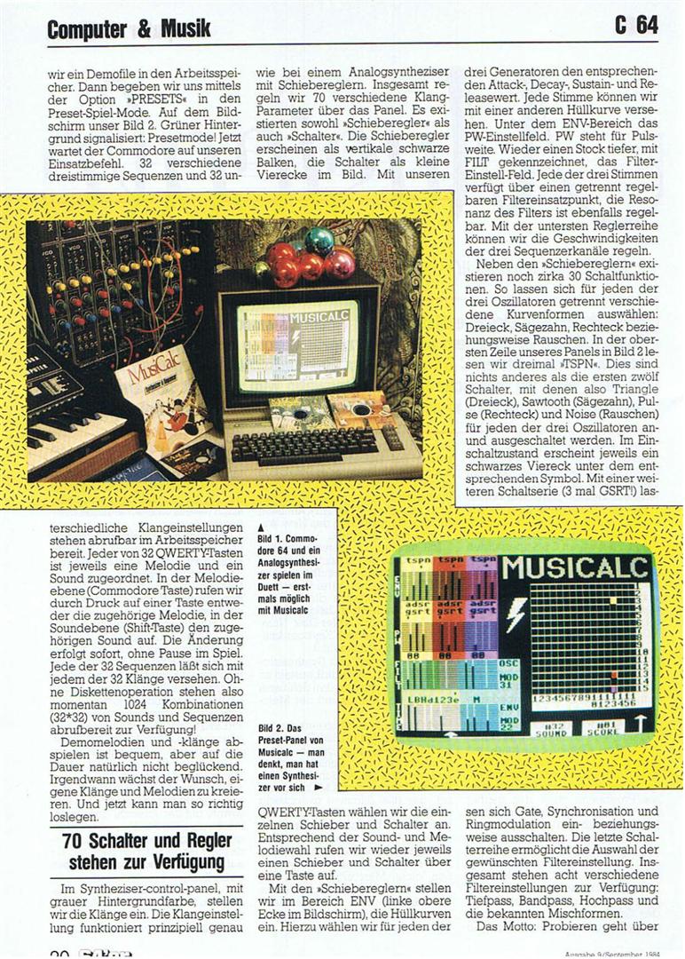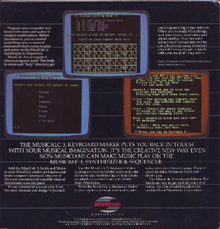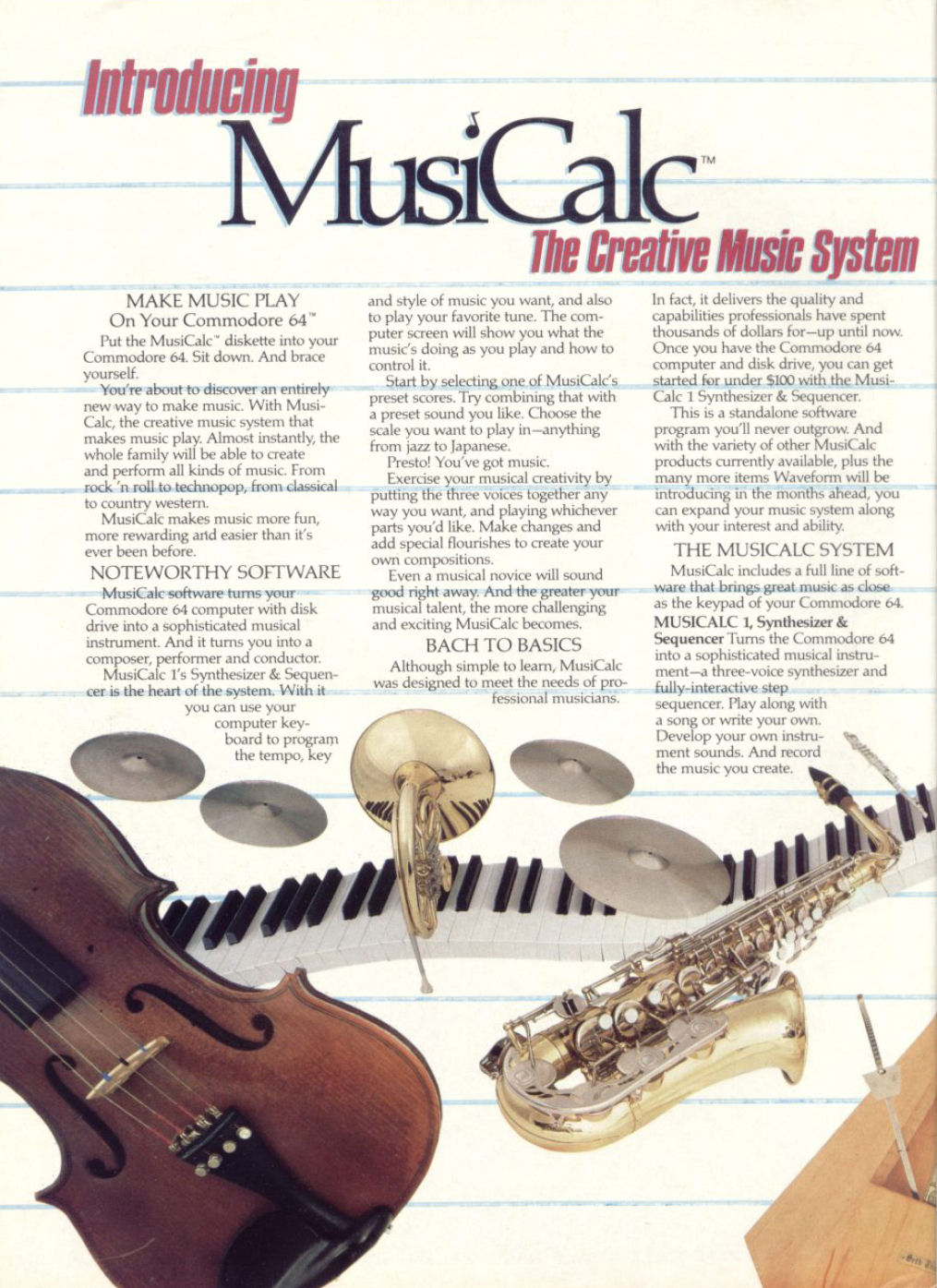 Die MusiCalc Software von Richard Wolton wurde 1983/84 von der Firma Waveform Corporation für einen Preis von ca. 500,- DM auf den Markt gebracht. MusiCalc 1-3 besteht aus einem Synthesizer & Sequencer, dem ScoreWriter sowie dem Keyboard Maker. Das Programm gehört zu den aufwendigsten Musikprogrammen für den C64/C128. Interessant sind die bunten, bedruckten 5,25 Zoll Disketten des Keyboard Makers.