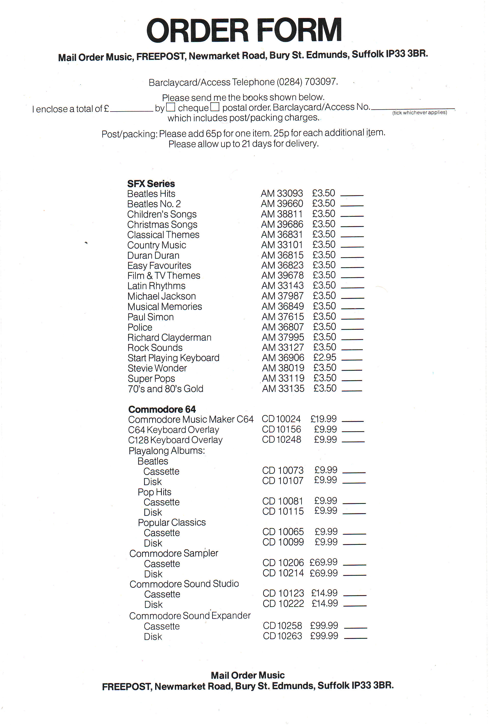 Das Music Maker Playalong Album „Pop Hits“ wurde 1985 von Commodore SFX unter der Lizenz von Music Sales Limited verkauft. Folgende Songs sind enthalten : All Right Now, Bright Eyes, (The) Candy Man, (The) Entertainer, House Of The Rising Sun, I Write The Songs, Morning Has Broken, Sailing, Streets Of London, Telstar, Thank You For The Music, (The) Winner Takes It All.