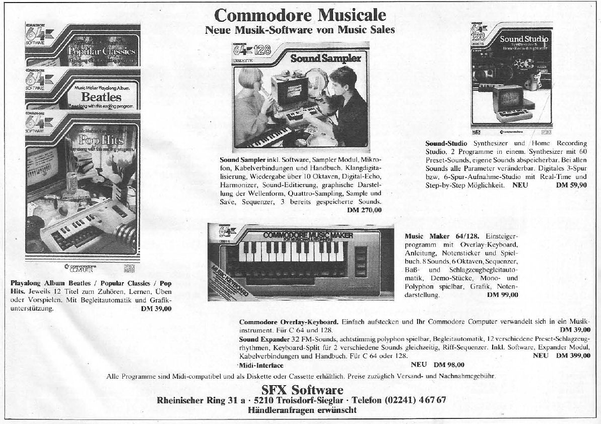 Für den Commodore 64/128 gibt es aufgrund der guten Eigenschaften des SID-Chips viele Erweiterungen im Sprach-, Sound- und Musikbereich. Einen ganz speziellen Versuch, auch den Musikmarkt im Computerbereich zu erschließen, startete Commodore 1984 mit der Einführung der Commodore SFX Serie. Leider waren die Geräte in Deutschland sehr teuer. Insgesamt konnte sich die SFX Serie nur wirklich in England etablieren. In England entstand auch die „Commodore 64 Computer Compendium Edition“, welche mit dem Musik Maker Keyboard und Software ausgeliefert wurde. Die Rechte an der SFX-Serie hatte nicht etwa Commodore sondern die Firma SFX Computer Software, eine Tochtergesellschaft der englischen Music Sales Limited. Einige der hier vorgestellten Geräte oder Module sind heute leider sehr schwierig zu bekommen.
