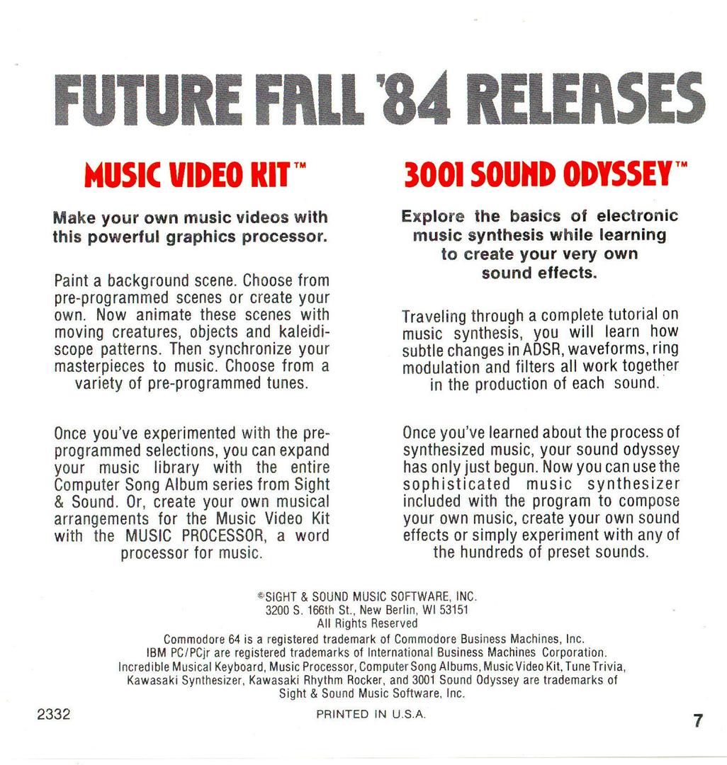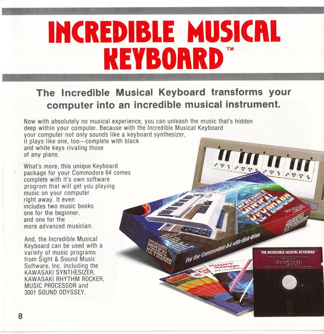 Das Incredible Musical Keyboard wurde 1984 von der Firma Sight & Sound Music Software Inc. auf den Markt gebracht. Das Keyboard wird einfach auf die Tastatur des C64 gesteckt und bietet 24 Tasten. Es wird gemunkelt, daß Commodore SFX das Design des „Music Maker Keyboard“ vom Incredible Musical Keyboard kopiert hat. Die Firma Sight & Sound brachte einige Softwaretitel in Kooperation mit Kawasaki für die Verwendung mit dem Incredible Musical Keyboard auf den Markt. In Deutschland wurde das Keyboard von Ariola Software vertrieben.