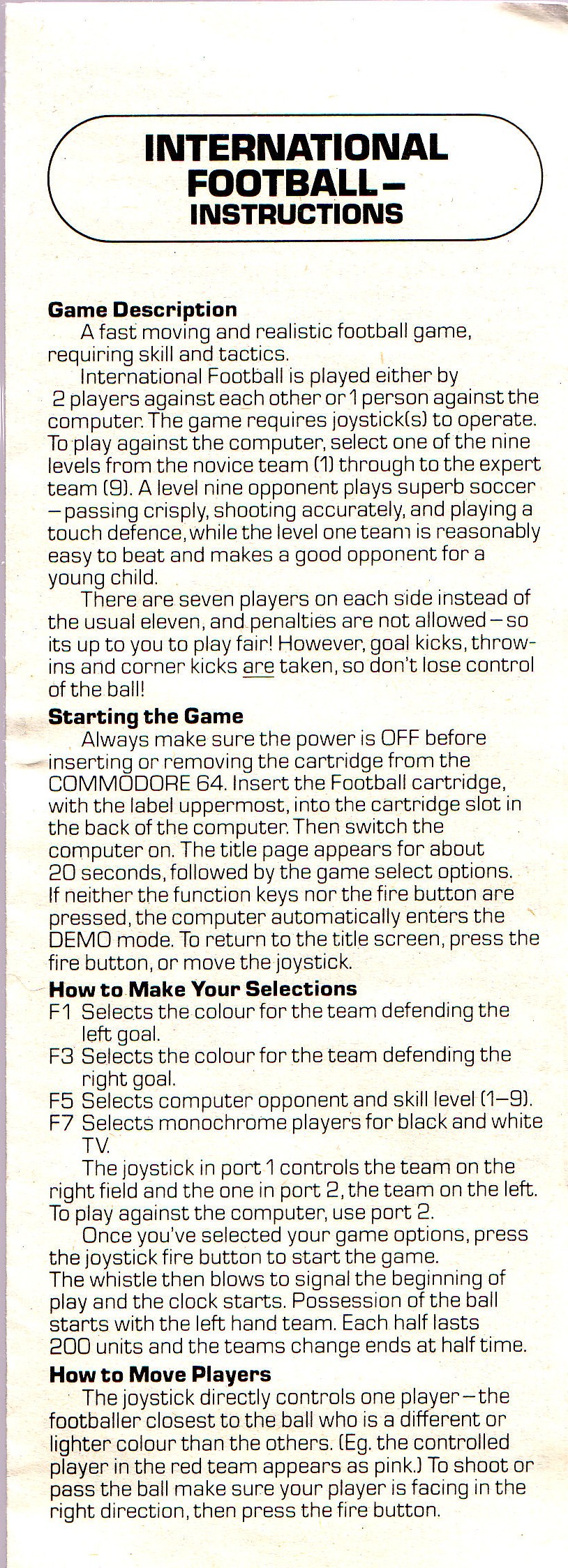 Diese Version von International Soccer enthält eine großformatige Anleitung und wurde zusammen mit dem EM-Paket von 1984 als Bundle-Version verkauft.