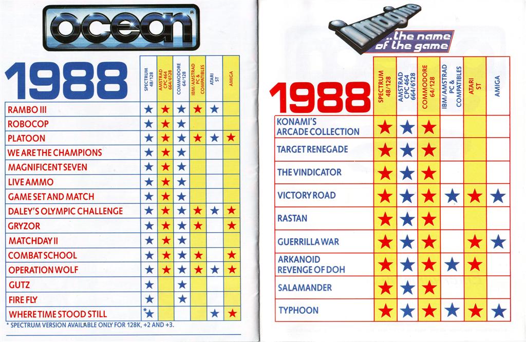 Inhalt : Match Day 2, Platoon, Gryzor, Rambo 3, Combat School, Operation Wolf, Where Time Stood Still, Daley Thompson’s Olympic Challenge, Gutz, Robocop, Firefly, We Are The Champions Compilation, Live Ammo Compilation, 10 Hit Games Compilation, Magnificent Seven Compilation, Target Renegade, Arkanoid Revenge Of Doh, The Vindicator, Salamander, Victory Road, Rastan, Guerrilla, Typhoon, Konami Arcade Collection.
