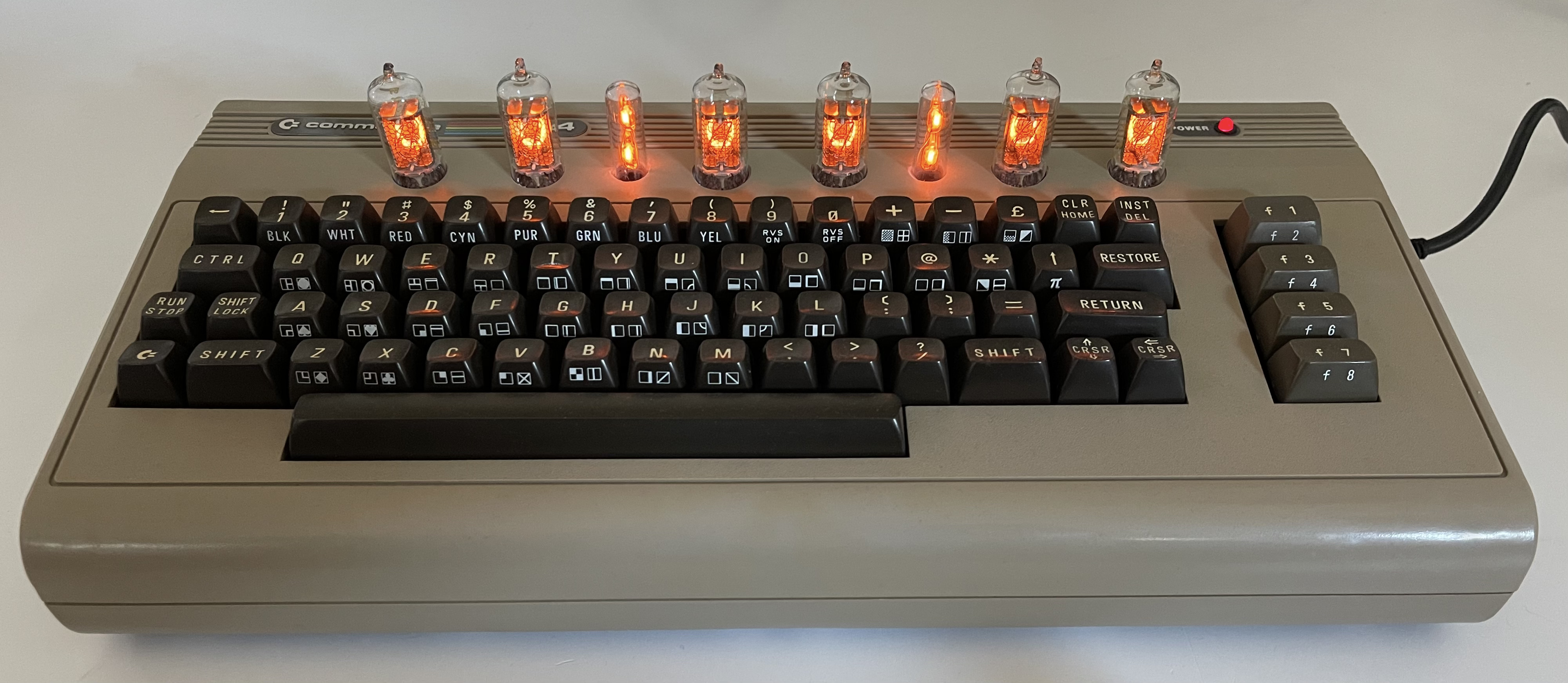 The C64 Nixie ist ein privates Projekt von Jörg Wittiber aka Hucky. Dieses wunderbare Projekt läuft eigentlich unter dem Namen „C64 Nixie Uhr„. Jörg hat es geschafft mit einem Commodore 64, einer auf Eprom gebrannter Steuersoftware, sowie zwei aussergewöhnlichen Platinen insgesamt sechs Nixie Röhren zu steuern. Die Doppelpunkte hat er aus Reagenzgläsern selbst hergestellt. Diese blinken im Sekundentakt mit. Nach dem Einschalten des Geräts leuchten die Doppelpunkte dauerhaft. Über die Tastatur kann nun die Startuhrzeit in Stunden, Minuten und Sekunden eingegeben werden. Auch wenn auf einem angeschlossenen Bildschirm die Uhrzeit angezeigt wird, kann die Eingabe völlig ohne einen Bildschirm erfolgen. Mit F7 wird die Uhr zurück gesetzt. Mit F1 gelangt man in den Startbildschirm des C64 während die Uhr weiter läuft.