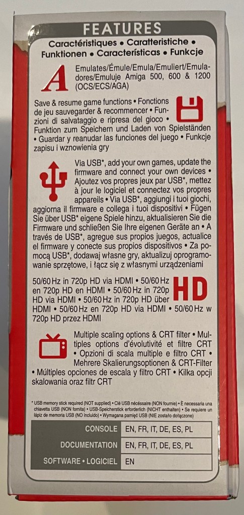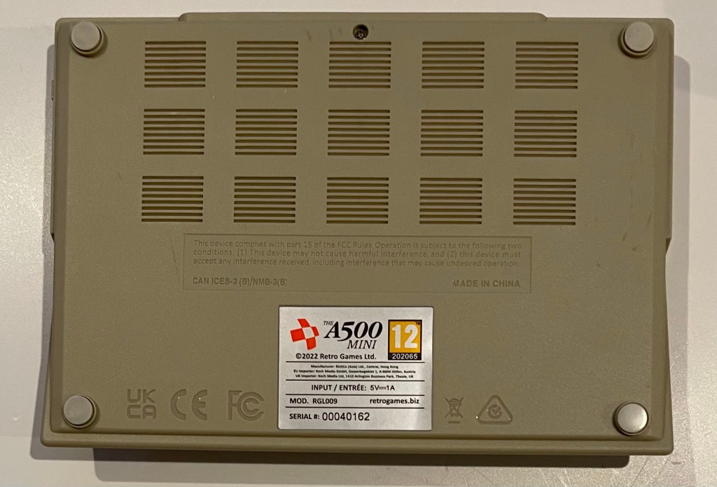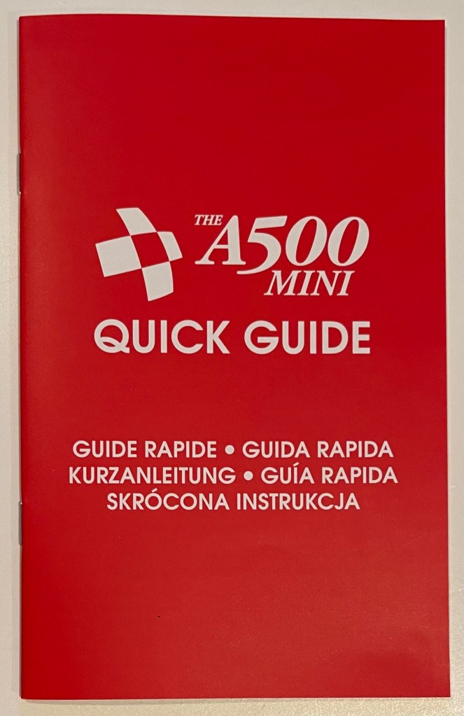The A500 Mini ist die neueste Veröffentlichung von Retro Games Ltd. (retrogames.biz). Der „Amiga“ A500 Mini basiert auf einer Ein-Platinen-Lösung ähnlich einem Raspberry Pi mit einer Corden A53 ARM-CPU und einer Mali T720 GPU. Das Gerät hat 512 Megabyte Arbeitsspeicher. Für den Anschluß externer Peripherie stehen 3 USB-Ports zur Verfügung. Weiterhin besitzt das Gerät einen HDMI Anschluss und einen USB-C Anschluss für die Stromversorgung. Dem Gerät liegt ein USB Gamepad, eine optische USB Maus, ein HDMI Kabel und ein USB A-C Kabel bei. Ein Netzgerät liegt dem Gerät nicht bei. Insgesamt sind 25 Spiele auf dem Gerät vorinstalliert. Über einen USB-Stick können eigene WHD-Load Inhalte auf dem A500 Mini abgespielt werden. Die Tastatur ist leider nur optisch vorhanden und hat keine Funktion.